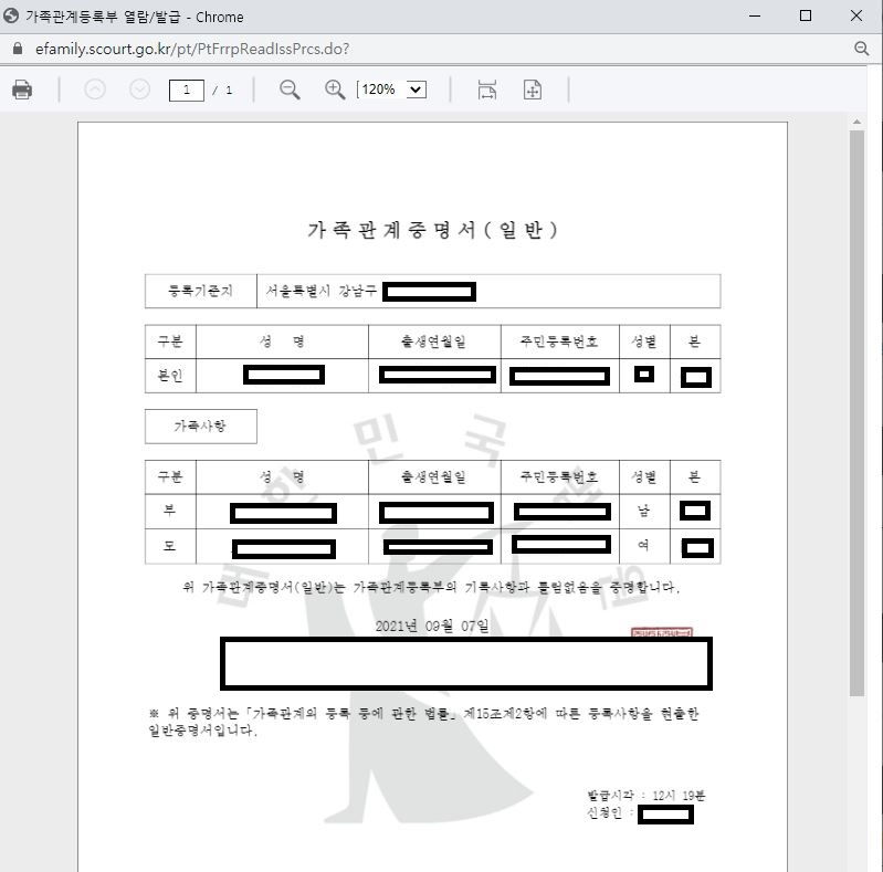 - 일반 증명서 : 가장 기본인 증명서입니다. 본인과 부모, 배우자, 생존한 현재의 혼인 중의 자녀에 관한 사항이 나옵니다.
