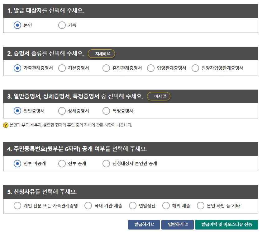 말 그대로 주민등록번호의 뒷자리를 그대로 공개할지의 여부를 선택해 주세요. 가족관계증명서에 나오는 모든 사람의 것을 비공개로 할 것인지, 모두 공개로 할 것인지, 신청 대상자인 본인의 주민등록번호만 공개할 것인지 중에서 선택할 수 있습니다.