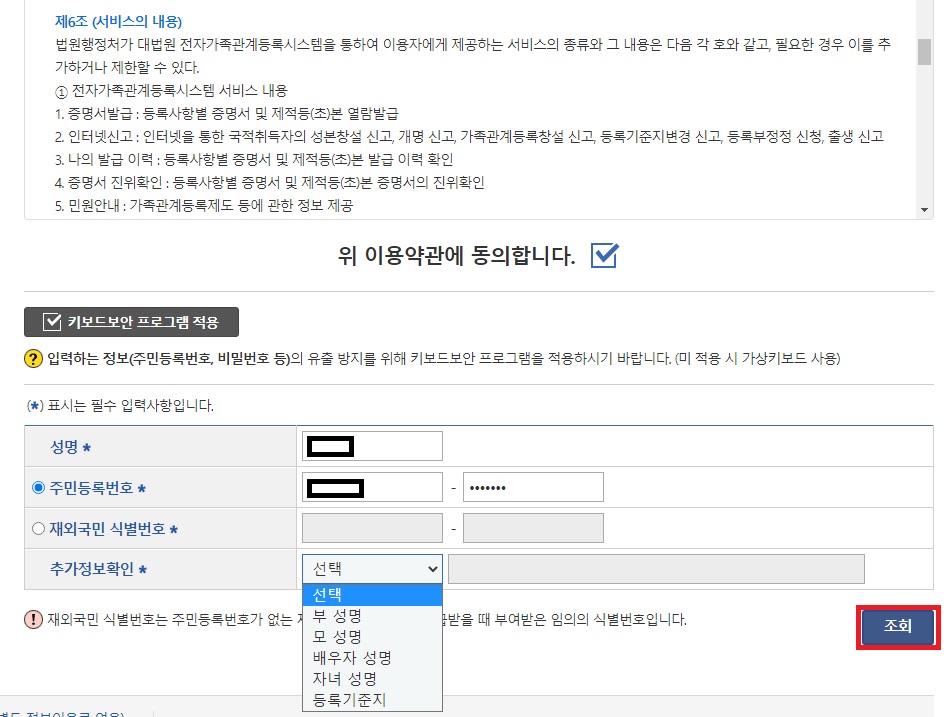 이용약관에 동의하시고 필수 입력 정보를 입력해 주세요. 필수 입력사항은 성명, 주민등록번호, 추가 정보 확인입니다. 여기서 추가 정보 확인은 본인 확인을 위해 본인의 가족등록사항 중 일부를 입력하도록 되어있는 것인데요, 부 성명(아버지 성명), 모 성명(어머니 성명), 배우자 성명, 자녀 성명, 등록기준지 중 하나를 선택해 내용을 입력해주시면 됩니다.