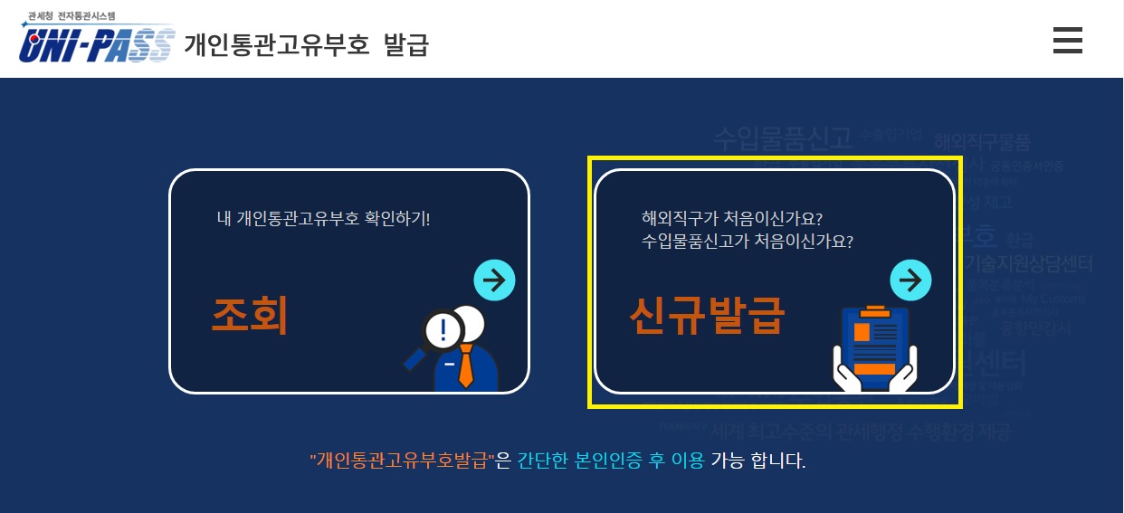 해당 사이트에 접속하면 위와 같이 개인통관고유부호 발급을 진행할 수 있는 관세청 전자통관시스템 유니패스 홈페이지로 들어가게 됩니다. 메인 화면에 아주 크게 조회 or 신규발급 메뉴가 있어요. 해외직구가 처음이거나 수입물품신고가 처음이어서 개인통관고유부호의 신규 발급이 필요하신 분들은 신규발급 메뉴를 클릭 해 주세요.
