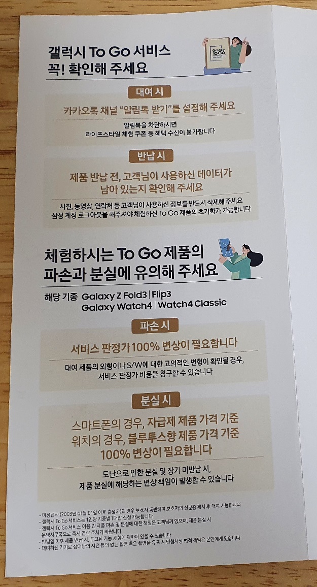 갤럭시 투고 서비스 주의사항에 대해 알아볼게요. 가장 중요한 포인트는 빌린 핸드폰과 시계를 반납 기간 전까지 빌렸을 때와 같은 상태로 반납을 하는 것입니다.