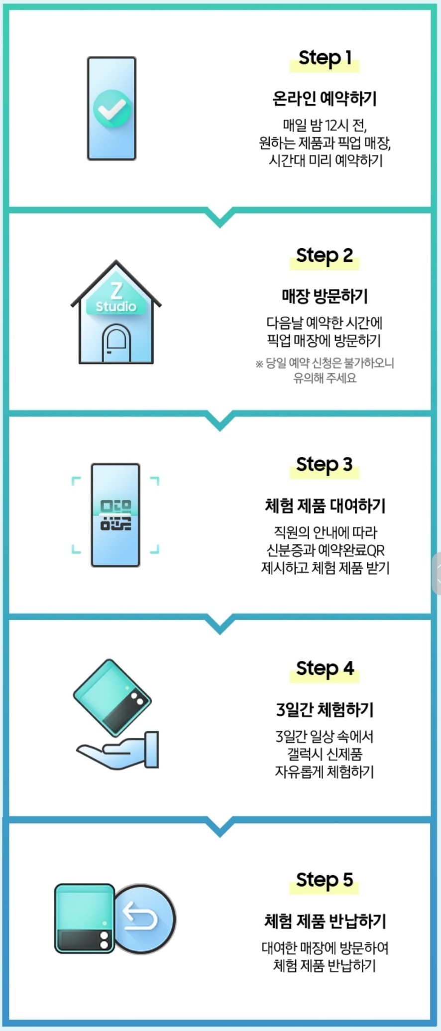 다음 날 예약 한 매장에 방문하셔서 신분증 및 예약 QR코드를 직원에게 보여주시고 제품을 수령하세요. 수령한 제품을 3일간 자유롭게 체험하신 뒤 대여했던 매장으로 방문해서 체험한 제품을 반납하면 되는 방식입니다.