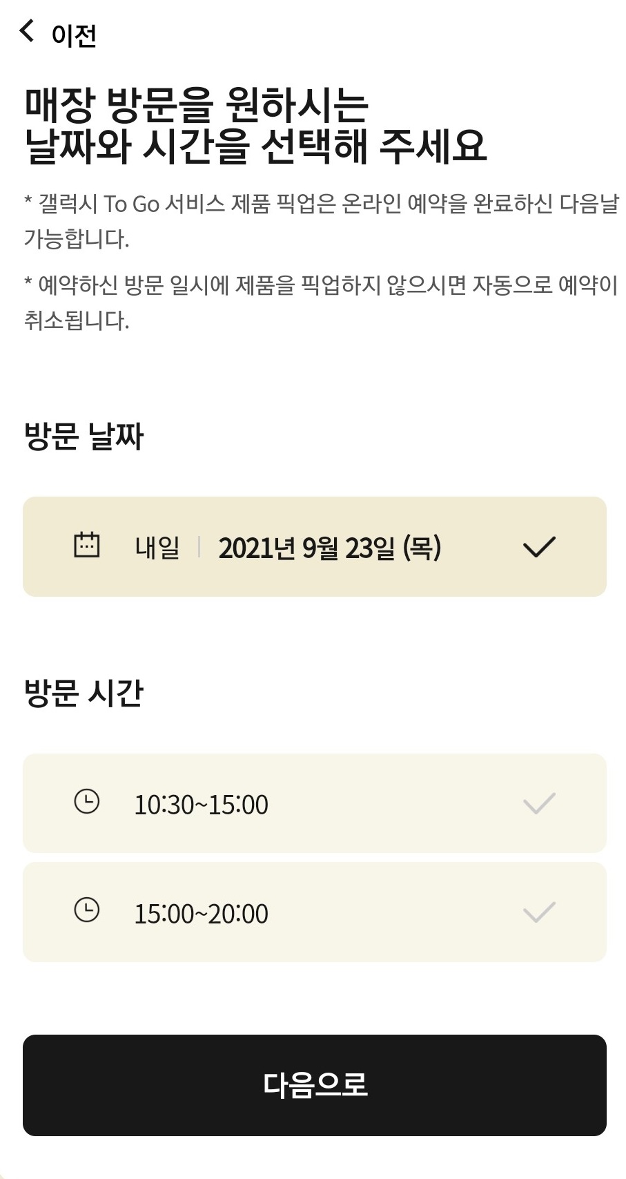 그러고 나서는 방문 날짜와 시간을 선택하게 됩니다. 방문 날짜는 자동으로 다음날로 선택이 되고요, 방문 시간은 두 가지 옵션 중에 선택할 수 있어요. 10:30~15:00 또는 15:00~20:00 중에 선택할 수 있게 되어있었는데요, 매장별 영업시간에 따라 조금씩 상이할 수 있습니다.