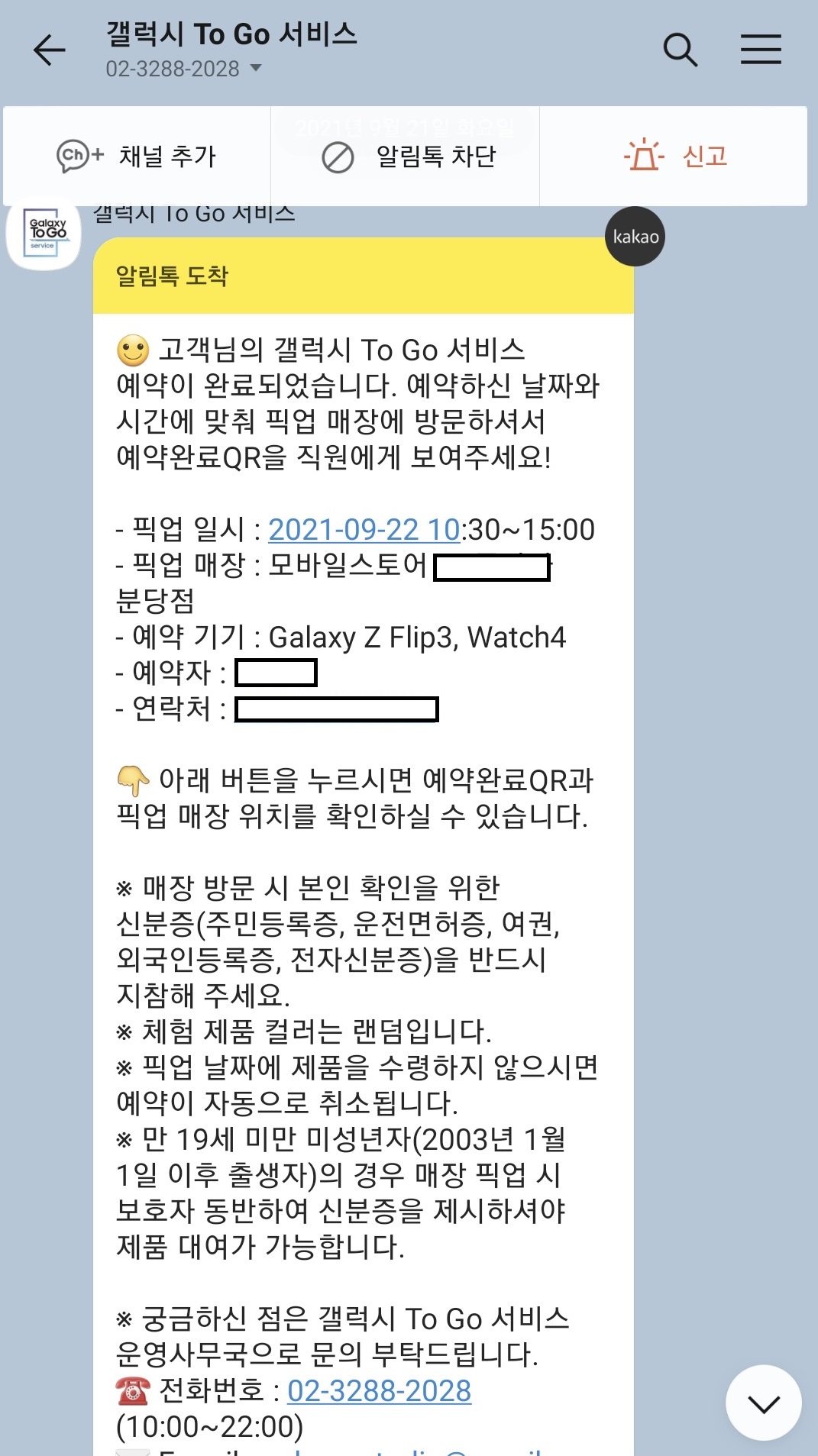 마지막으로 개인정보 수집 동의 후 본인인증까지 거치면 갤럭시 투고 서비스 예약이 완료됩니다.