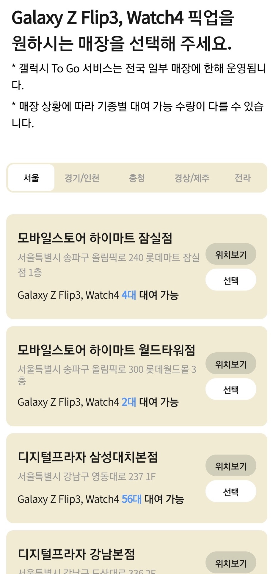 다음으로는 대여할 매장을 선택하시면 되는데요, 지역을 선택하시면 선택한 제품의 매장별 재고를 확인하실 수 있어요. 재고가 있고 본인이 방문하기 편한 매장을 선택해 주세요.