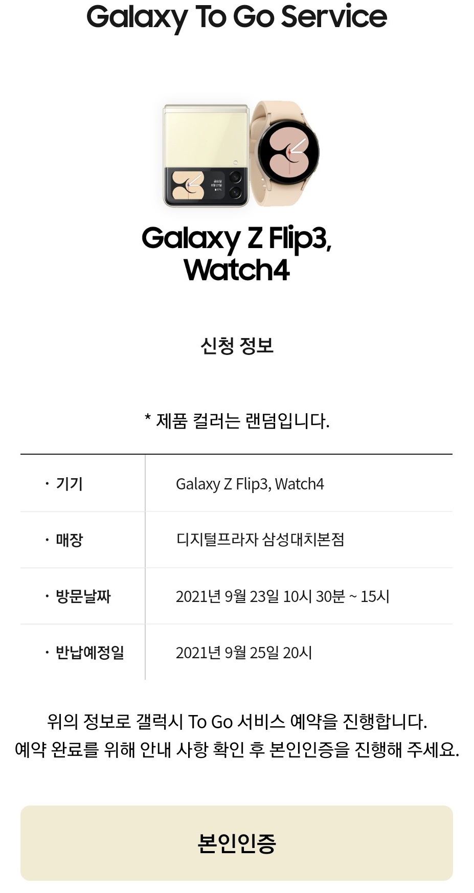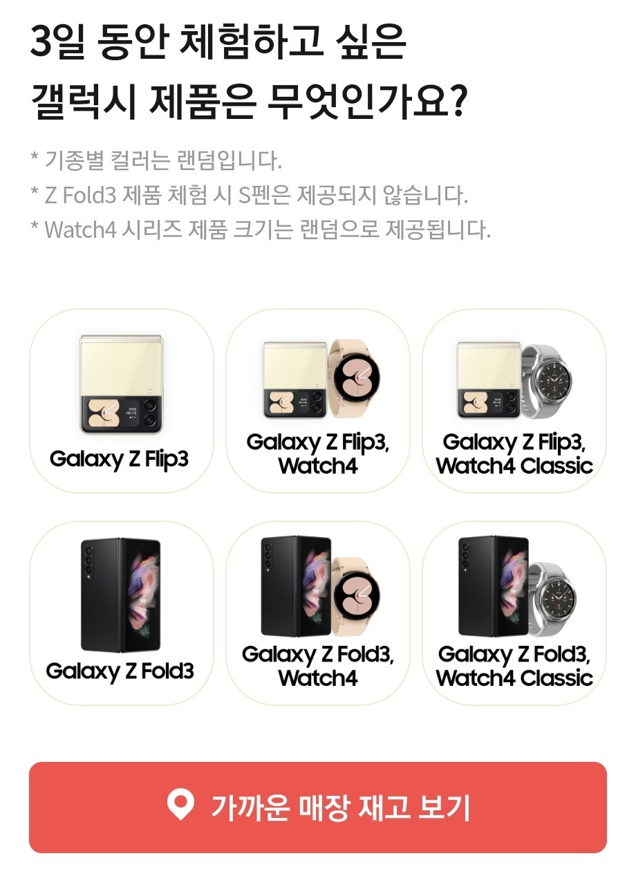 저는 플립3를 체험해보고 싶었는데, 대여하는 김에 와치도 써볼까 해서 갤럭시Z 플립3 & 갤럭시 와치4 옵션을 선택했습니다.