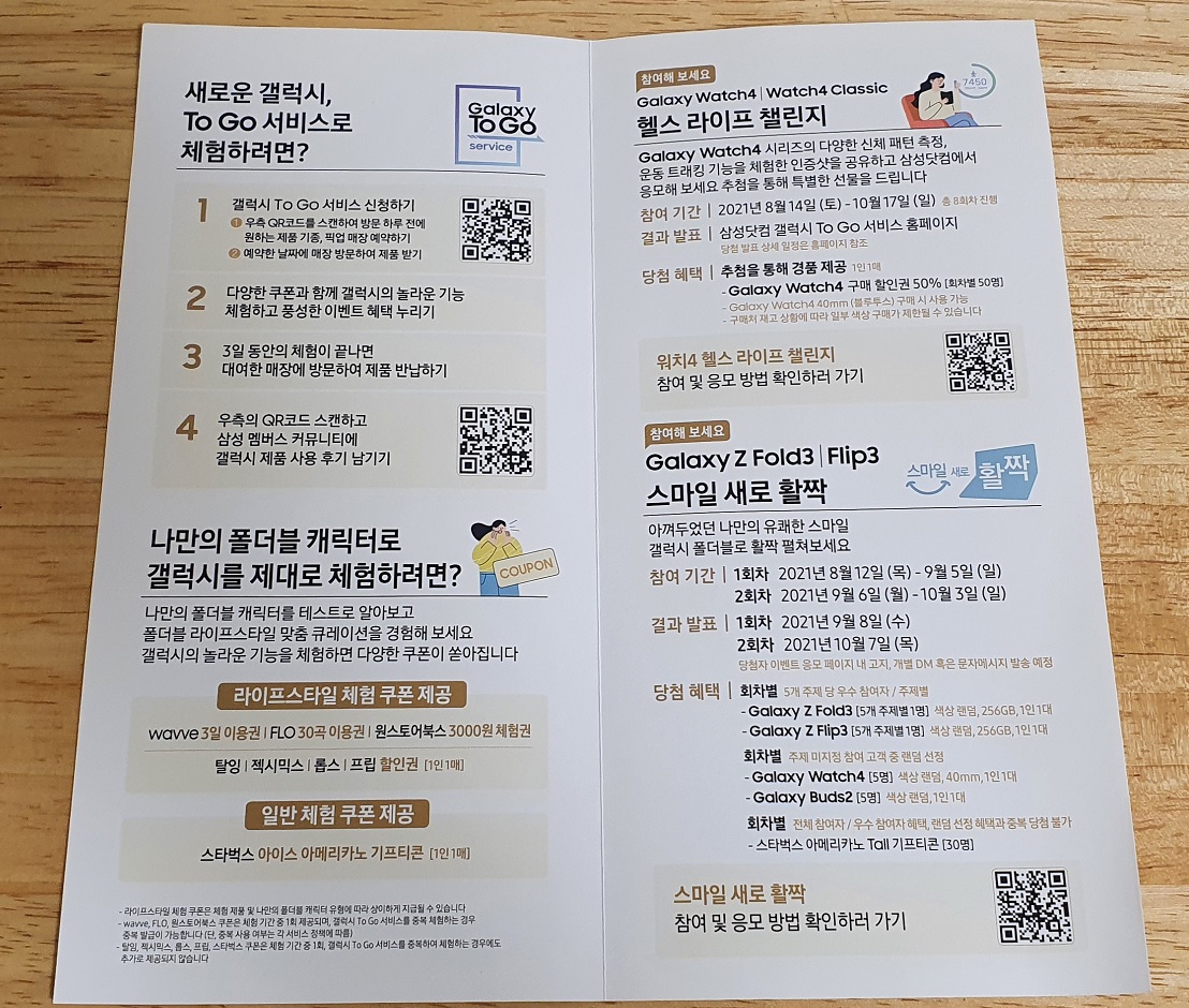 각종 이벤트도 진행 중이에요. 운이 좋으면 갤럭시 투고 서비스를 이용했다가 이벤트에 당첨되어서 갤럭시Z 폴드3나 플립3를 사은품으로 받을 수도 있으니까요, 꼭 참여하시는 것이 좋을 것 같네요.