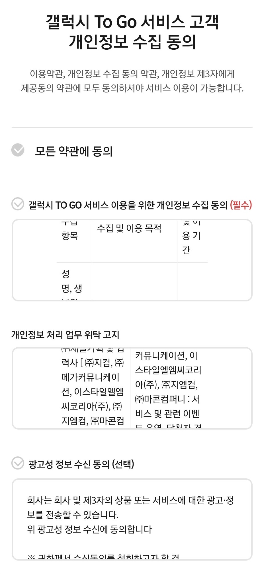 마지막으로 개인정보 수집 동의 후 본인인증까지 거치면 갤럭시 투고 서비스 예약이 완료됩니다.