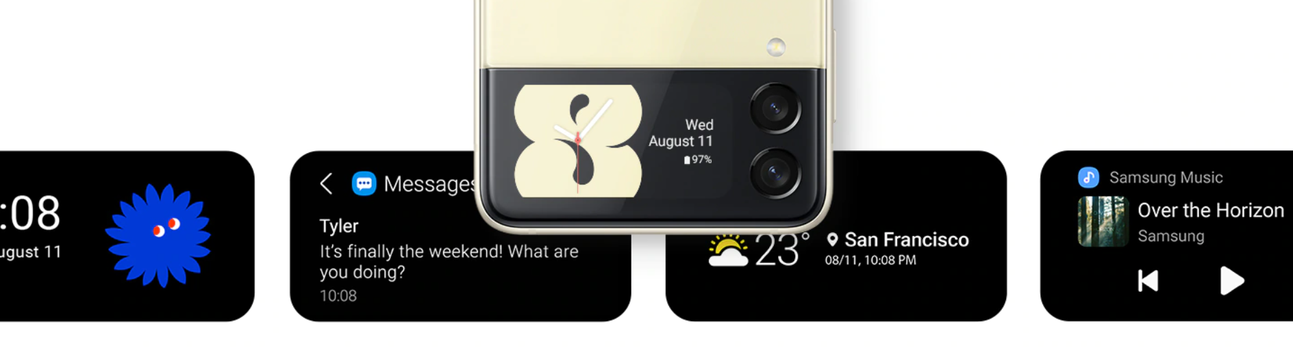 갤럭시Z 플립3는 반으로 접으면 한 손에 들어오는 콤팩트한 사이즈이기 때문에 휴대성이 좋아요. 전작 플립과 달라진 점은 커버 디스플레이의 크기가 굉장히 커졌다는 점인데요, 굳이 플립을 열지 않고서도 여러가지 기능을 실행할 수 있어서 사용자 편의성이 아주 높아졌습니다.