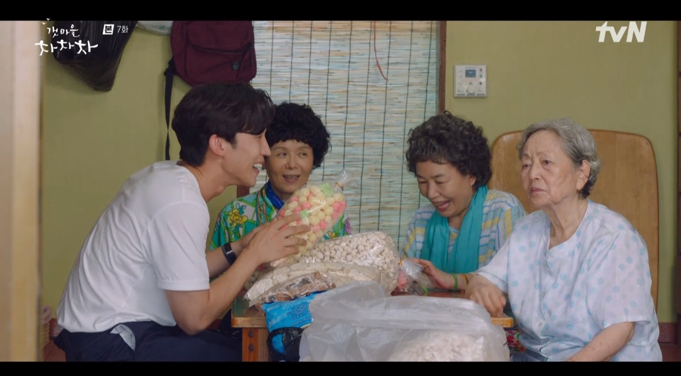 지성현은 시장에서 과자를 잔뜩 사 할머니들에게 갔어요. 뇌물 안 받는다는 김감리에게 할머니가 싫다고 해서 절대 여기서 촬영을 안 한다며 그냥 놀러 온 거니 편하게 드시라는 지성현이었습니다.