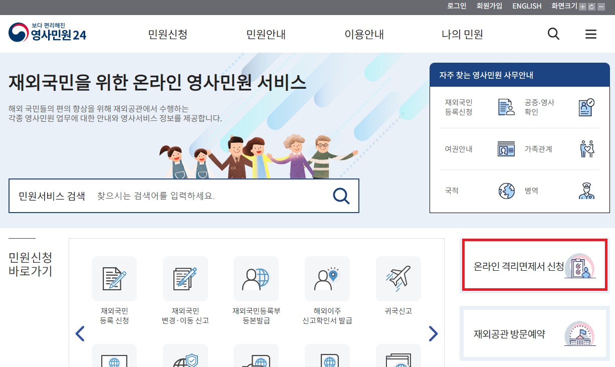 영사민원24 홈페이지에 접속하시면 오른쪽 하단쪽에 온라인 격리면제서 신청 버튼이 있을거에요. 해당 버튼을 클릭하고 들어가셔서 순서에 따라 신청 절차를 진행하시면 됩니다.