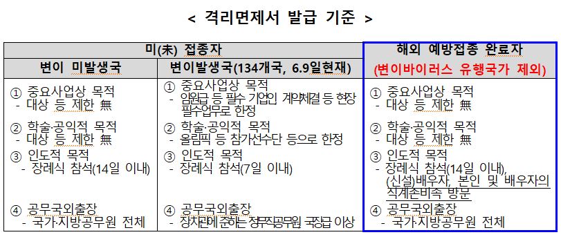 1. 해외예방접종완료자 격리면제서 조건, 대상