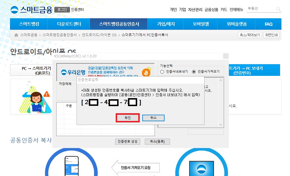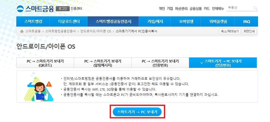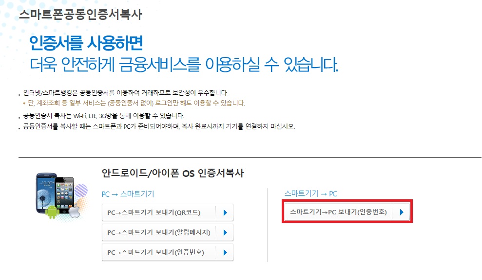 공인인증서를 복사하는 것은 두 가지가 있을 수 있죠. 하나는 컴퓨터의 인증서를 핸드폰으로 복사하는 방법, 하나는 핸드폰에 있는 방법을 컴퓨터로 복사하는 방법인데요, 오늘은 핸드폰에 있는 공인인증서를 컴퓨터로 복사 하는 것이니 스마트기기→PC 보내기(인증번호) 메뉴를 클릭 해 주세요.