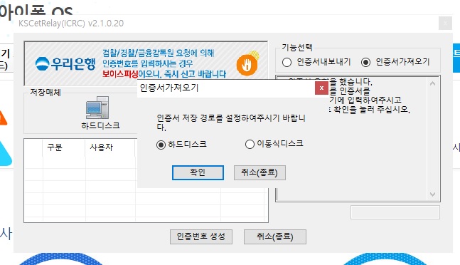 그럼 다시 이제 컴퓨터로 돌아와서 아까 12자리 숫자가 떴던 팝업창에서 확인 버튼을 눌러주세요. 그러면 공인인증서를 하드디스크에 저장할 지 이동식디스크에 저장할 지 선택하게 나오는데요, 편하신 옵션을 선택하셔서 저장을 해 주세요. 그러면 정말로 스마트폰에서 공인인증서 pc로 옮기기 완료 입니다.