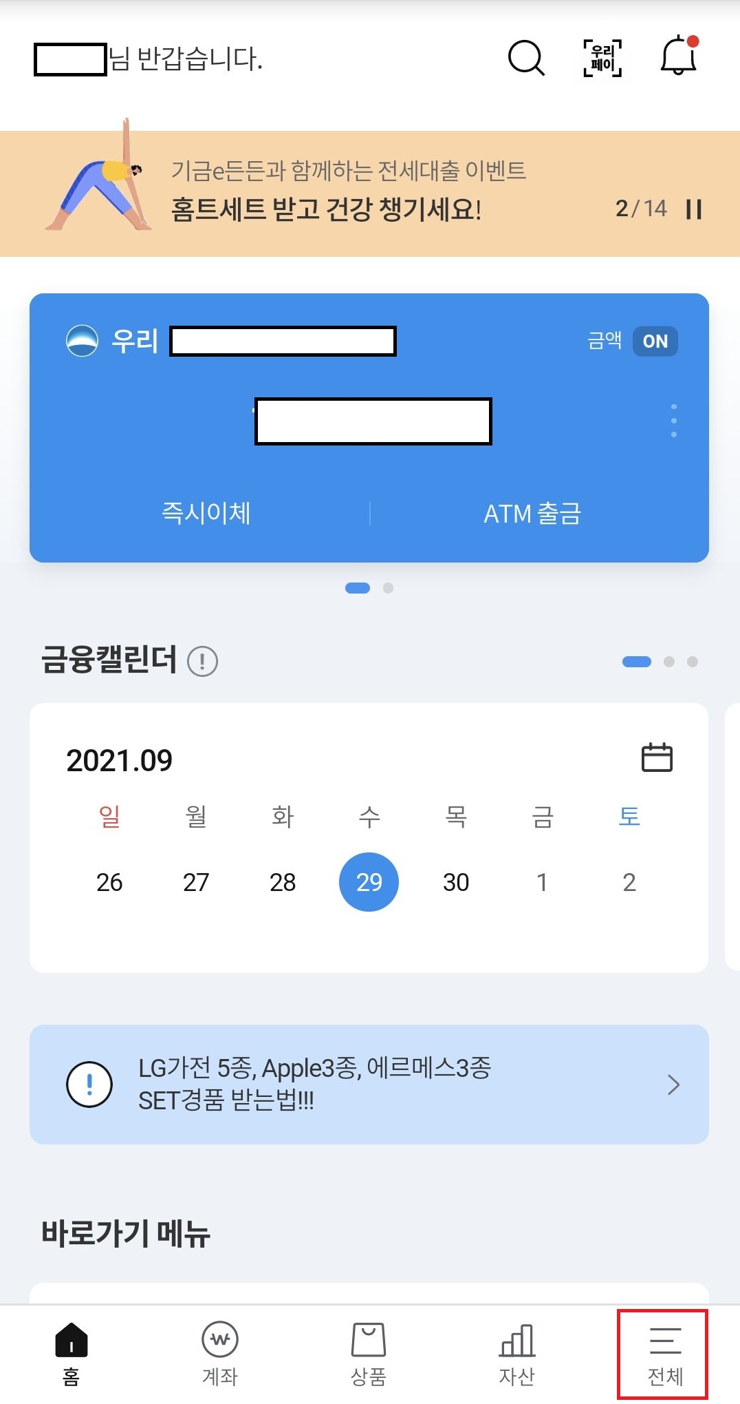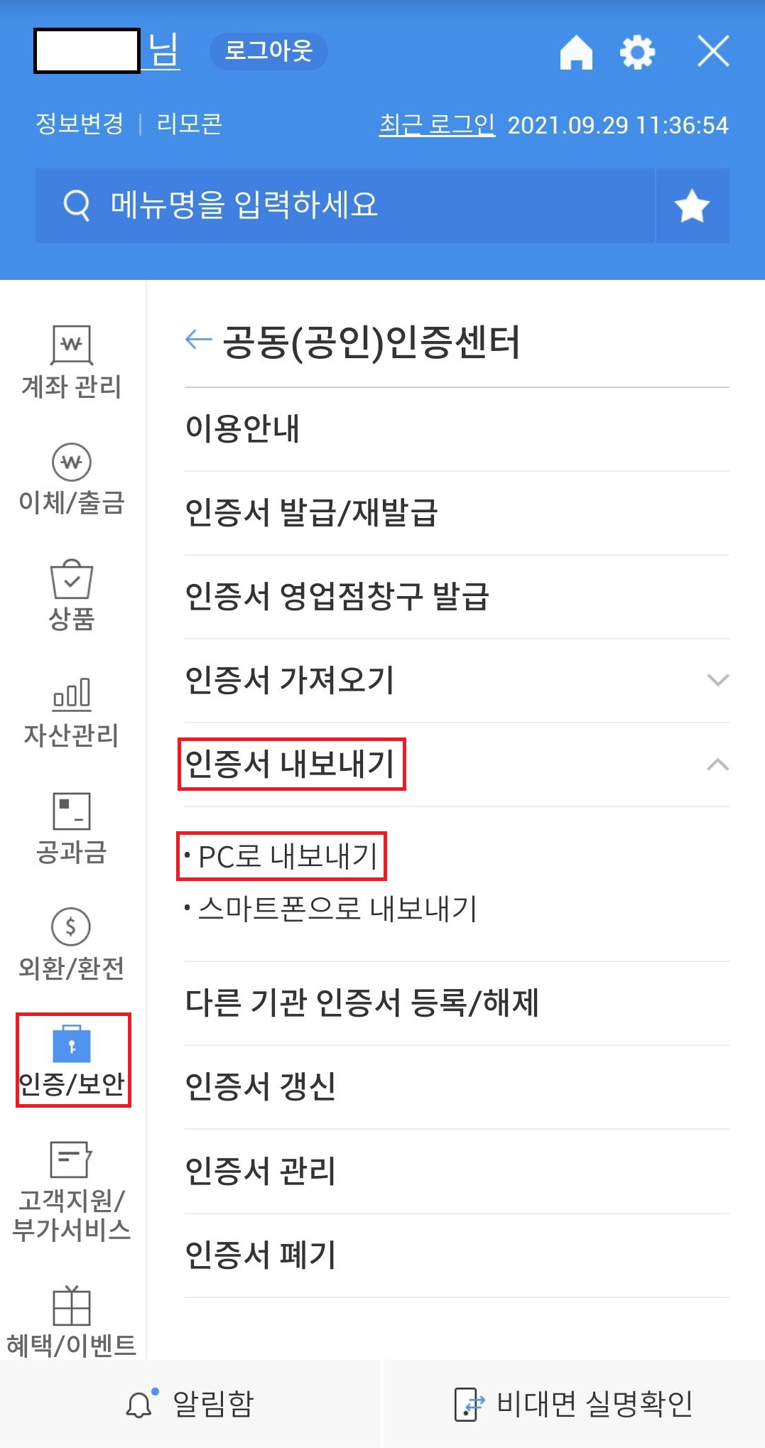 모바일뱅킹 앱을 실행해주세요. 우리은행의 경우 우리WON뱅킹 앱이죠. 어플을 실행하신 후 전체 메뉴에서 인증/보안 메뉴를 찾아 클릭 해 주시면 인증서 내보내기 메뉴가 있을거에요.