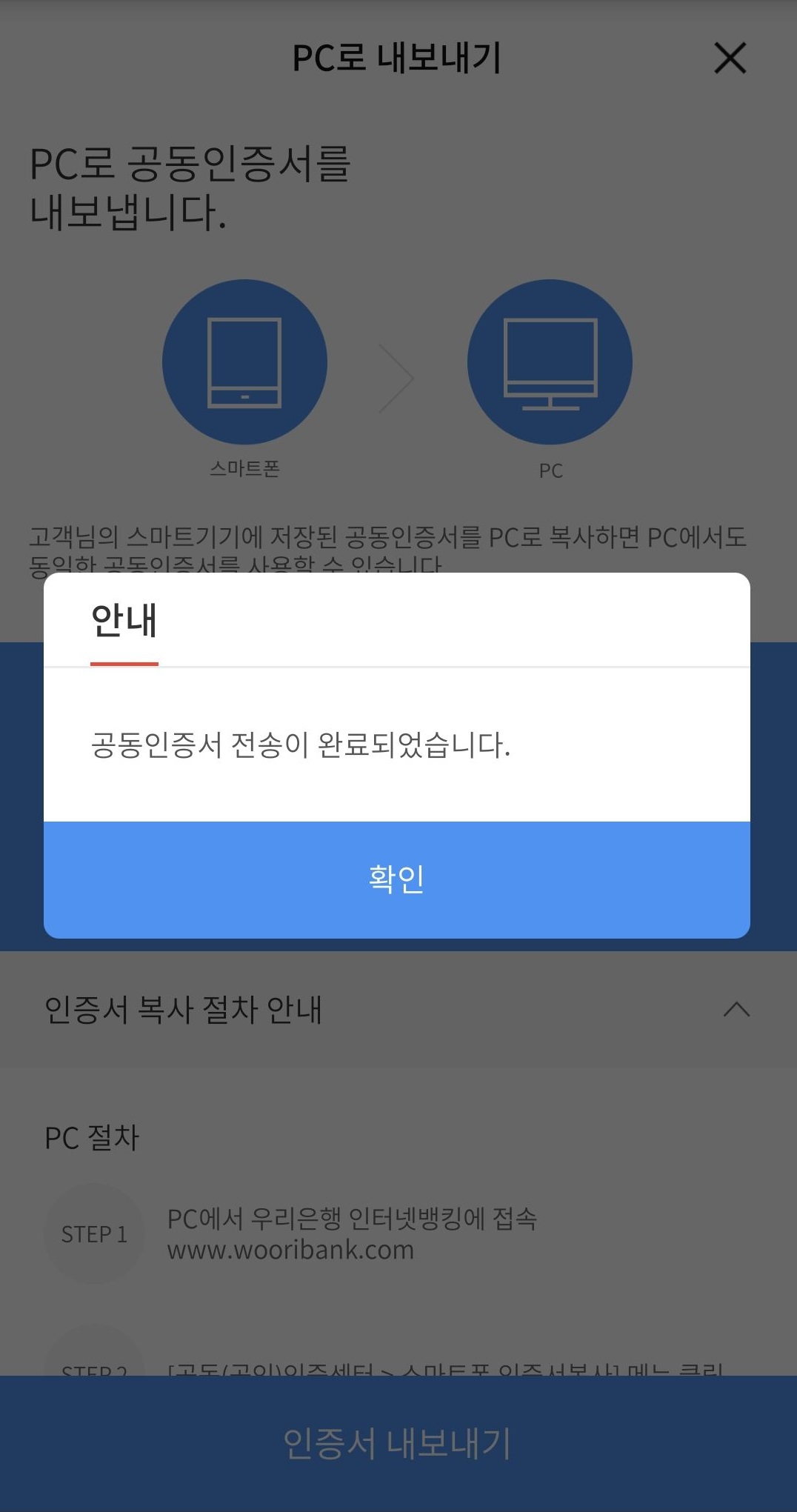 그러면 공인인증서 복사를 위한 프로그램을 설치하라는 메시지가 뜹니다. 설치를 완료 해 주신 후 스마트기기 → PC 보내기 버튼을 클릭 해 주세요.