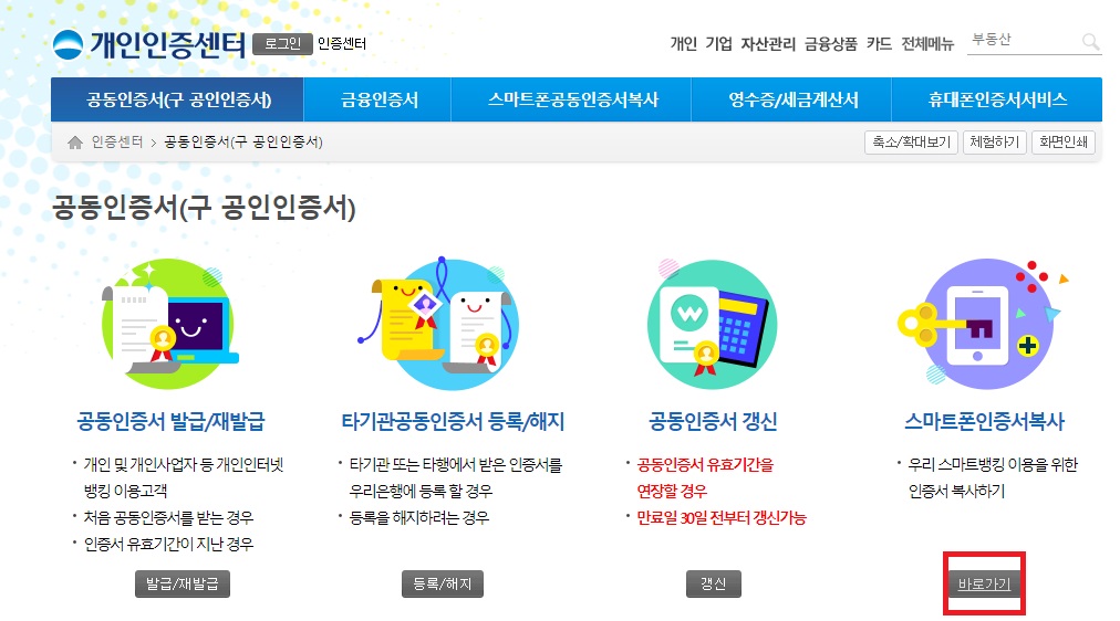 그러면 이렇게 우리은행 개인인증센터로 넘어가게 되는데요, 이 화면에서 공동인증서 발급, 재발급, 타기관 공동인증서 등록, 해지, 공동인증서 갱신, 스마트폰 인증서 복사 이렇게 총 4가지 작업을 할 수 있어요.