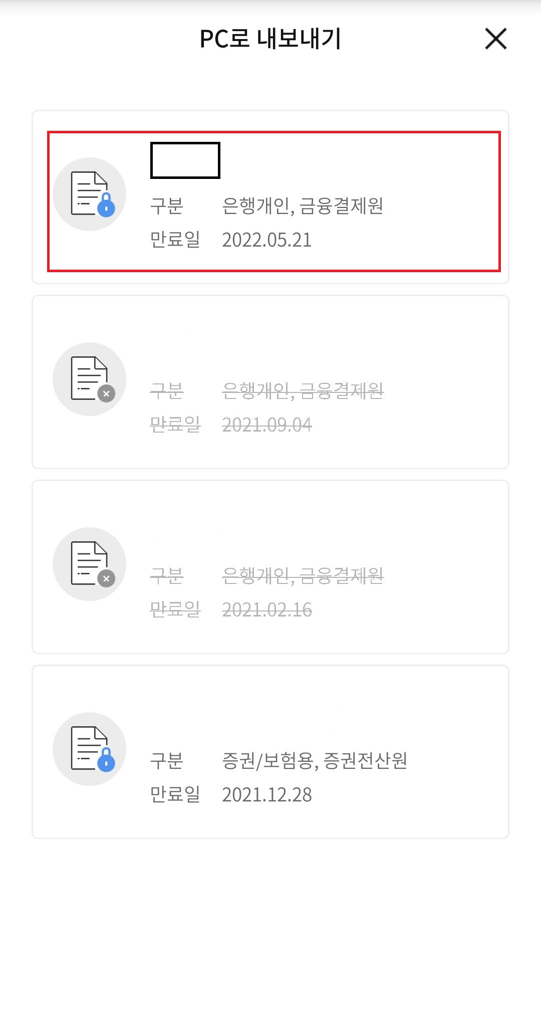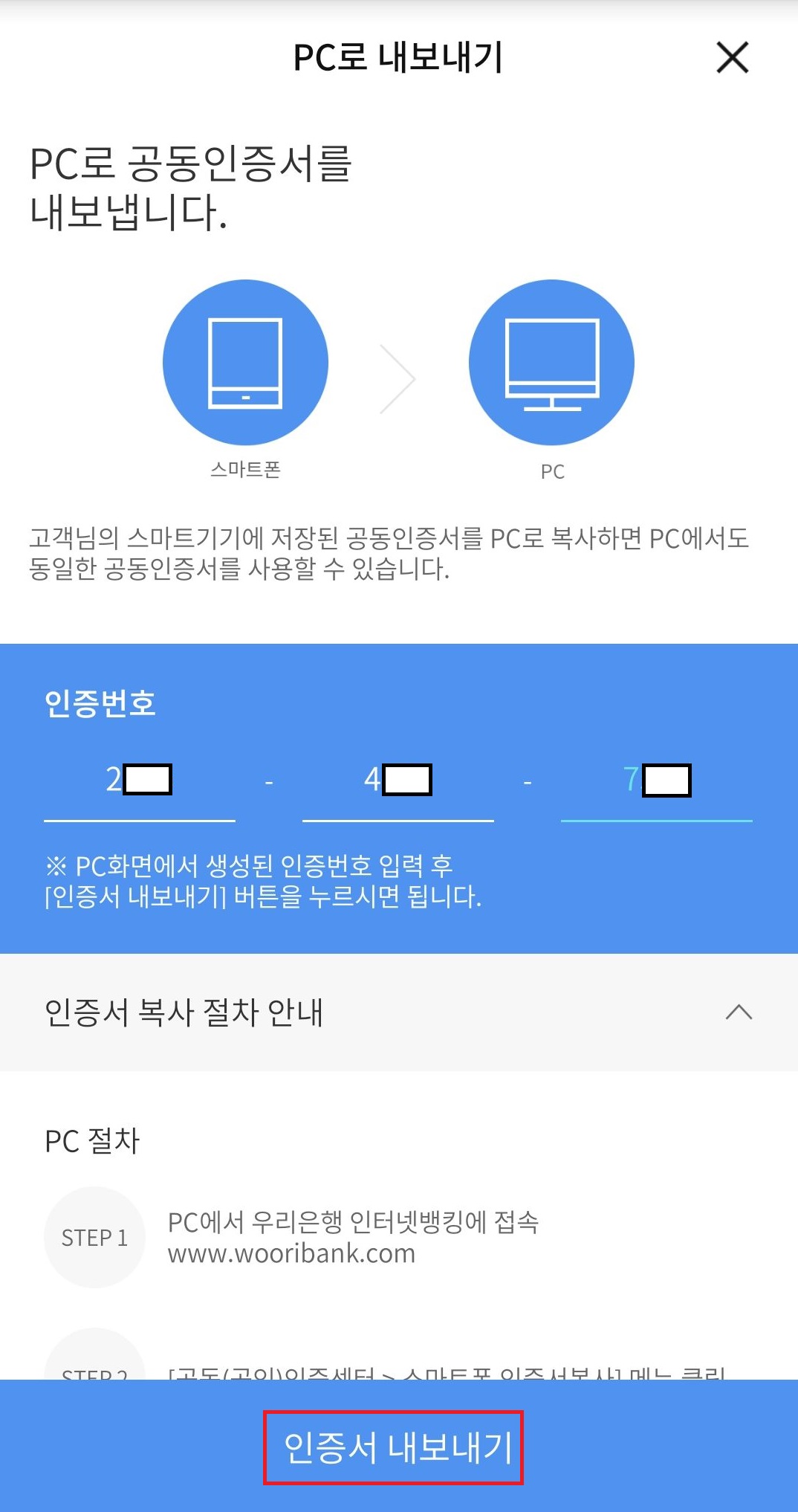 여기에서 PC로 내보내기를 클릭 해 주세요. 그 후에 스마트폰에서 PC로 옮기려고 하는 공인인증서를 클릭하고 비밀번호를 입력해 주세요.