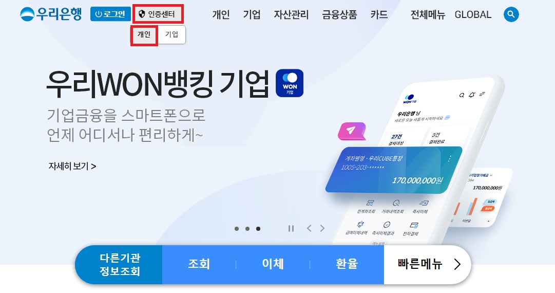먼저 우리은행 홈페이지로 접속을 해 주세요. 홈페이지에 접속하면 좌측 상단에 인증센터 라는 메뉴가 있는데요, 해당 메뉴에 마우스를 가져다 대면 개인, 기업 중 선택할 수 있게 뜹니다. 대부분 개인 고객이실테니 개인을 클릭하고 들어가주세요.