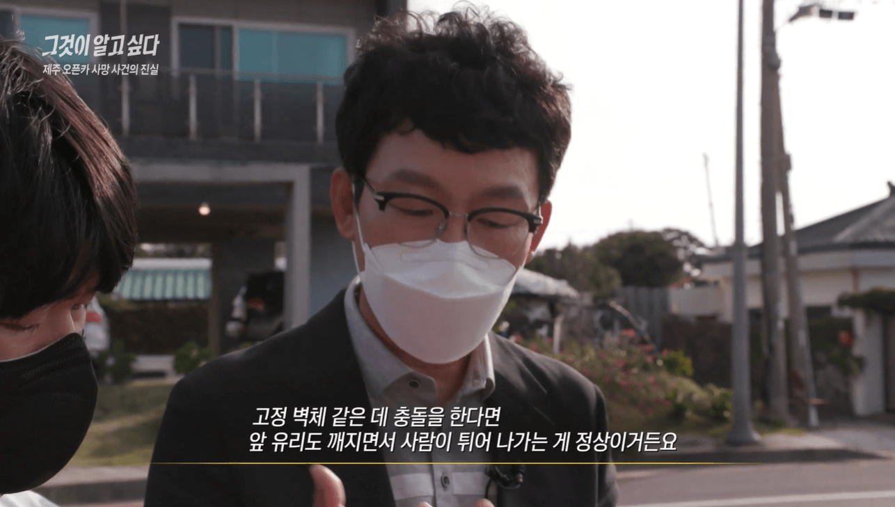 한 전문가는 앞유리가 깨지지 않은 것도 의문이라고 했어요. 고정 벽체 같은 곳에 충돌을 하면 앞 유리도 깨지면서 사람이 튀어 나가는 것이 정상이라는 의견이었죠. 앞유리 손상 없이 차량의 왼쪽 부분으로 조은애 씨가 날아갔다는 점이 이상하다는 의견이었습니다.