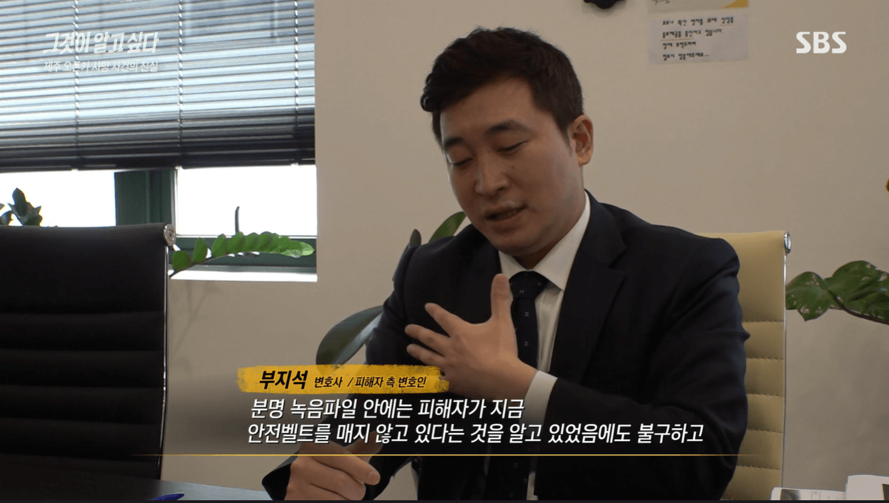 고의성이 있었다는 것을 숨기기 위해 둘 다 안전벨트를 매고 있었다고 한 것 같다는 조은애 씨 측 변호사 입장이었습니다.
