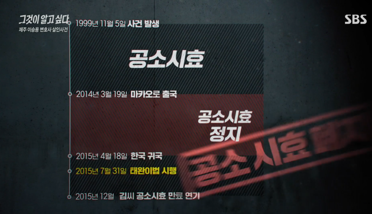 마카오로 출국되어 있는 동안 공소시효가 정지되어있었고, 그렇게 공소시효 만료는 2015년 12월로 연기되었는데 2015년 7월 살인죄에 대한 공소시효를 폐지한 태완이법이 시행되면서 김씨가 체포될 수 있었던 것입니다.