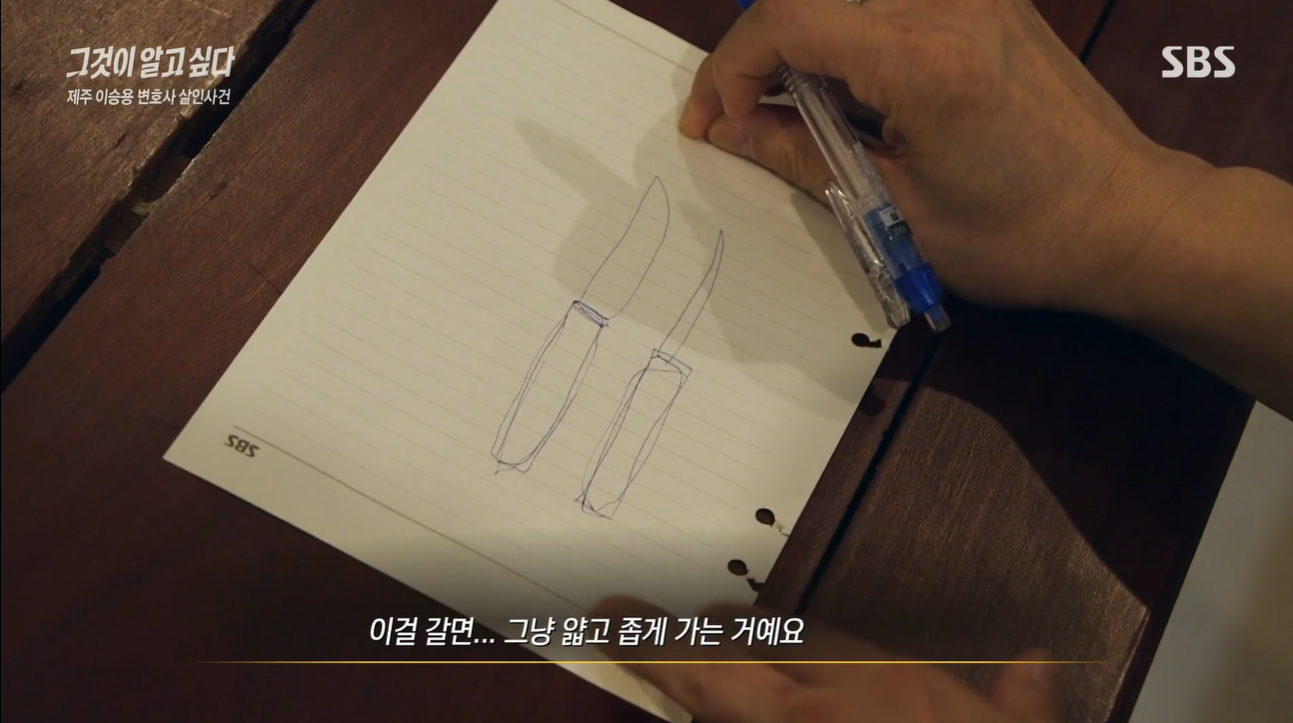 게다가 김씨에게 직접 협박을 당했던 그 여자 역시 그 칼을 기억하고 있었어요. 김씨가 그것이 알고싶다 팀에게 갈매기의 범행도구라고 그려주었었던 그 칼과 유사한 형태라고 했죠.