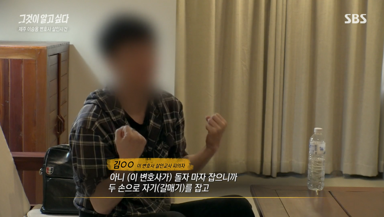 그렇게 그것이 알고싶다 팀은 다시 김씨가 체류중이던 캄보디아로 가 취재를 하게 되었습니다. 사건은 당시 제주도의 유탁파 두목과 관련이 된 일이라고 했었어요. 유탁파 두목이 이승용 변호사를 혼내주라고 지시했고, 이 사람은 같이 유탁파에 있던 친구인 갈매기와 상의를 했었다고 했어요.