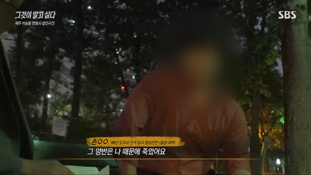 그것이 알고싶다가 찾아간 손씨. 본인 때문에 이승용 변호사가 죽었을 것이라고 했습니다. A후보 캠프에서 받은 돈을 기록한 장부와 금품 살포의 증거인 영수증을 이변호사에게 본인이 넘겼고, 그렇기 때문에 이변호사가 표적이 되었을 것이라는 것이죠.