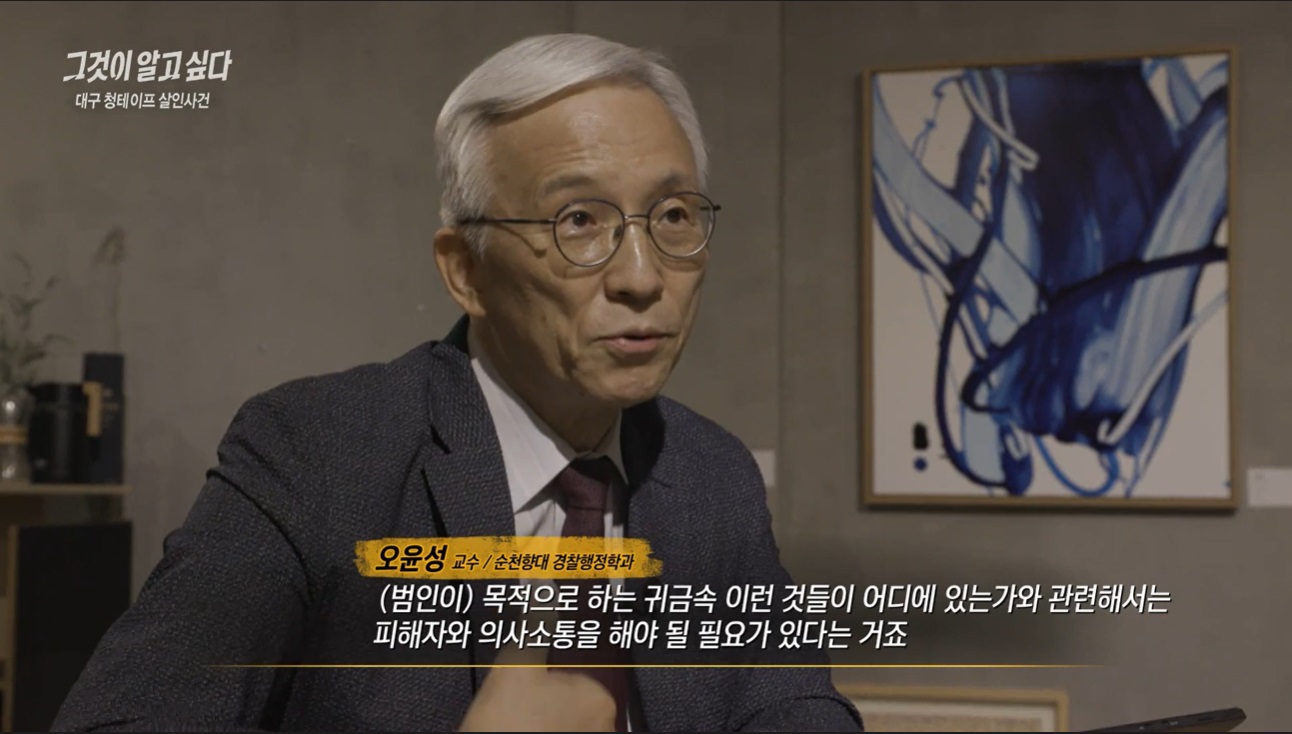 박지선 교수는 범인은 면식관계이면서 집안의 내부 구조를 굉장히 잘 알고 있고 피해자의 집에 최소한 몇 시간 이상 올 사람이 없다는 것을 잘 알고있는 사람일거라고 했어요.