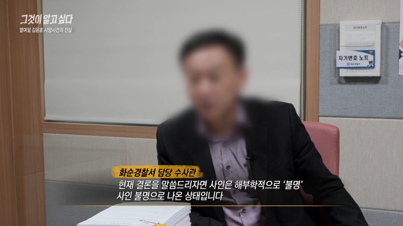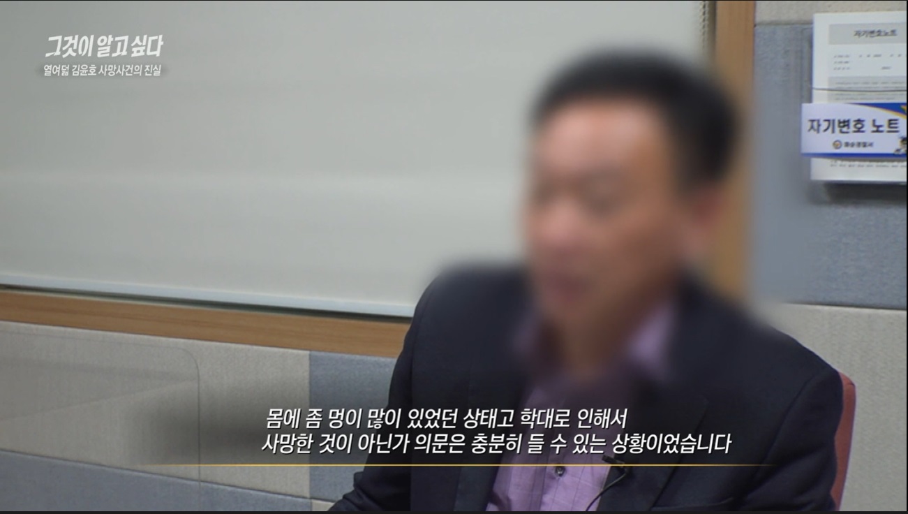 그런데 더 이해하기 어려웠던 것은 부검 결과였어요. 윤호의 사인은 해부학적으로 불명 이라고 했습니다. 윤호의 온몸에는 멍과 상처가 있었지만 그것들이 직접적인 사인은 아니었던 것이죠.
