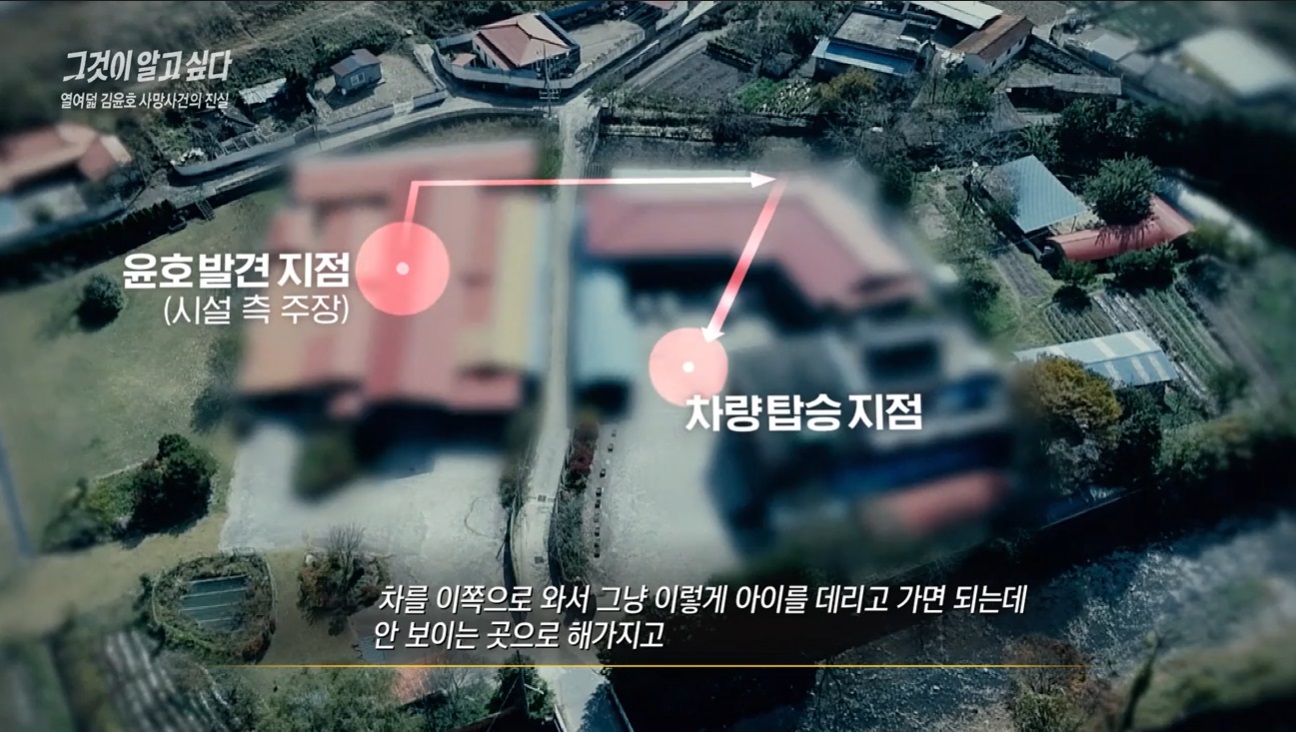 가장 수상한 것 중 하나는 윤호가 의식을 잃었을 당시의 동선 이었어요. 윤호가 처음 발견된 곳에서 빠른 길로 나오지 않고 빙 둘러 나와 차에 태웠다는 것이었죠. 윤호가 낮잠을 자고 있었다는 장소로부터 차량을 탑승한 지점까지는 문을 6개는 지나야했고 신발을 신었다 벗었다 해야 하는 환경이라고 했어요. 아이가 의식을 잃었던 위급한 상황의 동선이라고는 이해할 수가 없었다는 것이었죠. 정말로 윤호가 시설측에서 주장하는 장소에서 낮잠을 자고 있었던 것이 맞는지부터 의심이 되는 것 같았습니다.