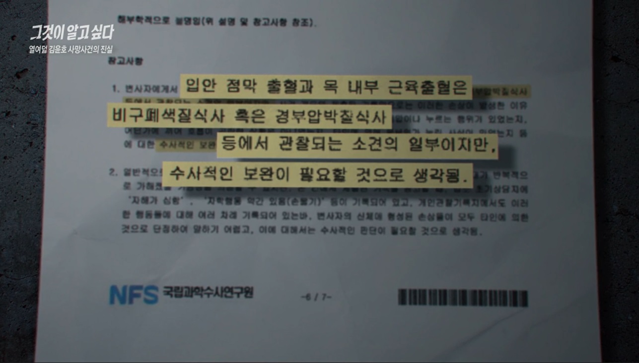 또 부검감정서에는 코와 입, 목부위의 눌림에 의한 질식사를 배제하기 어려워 수사적인 보완이 필요하다고 되어있었어요.