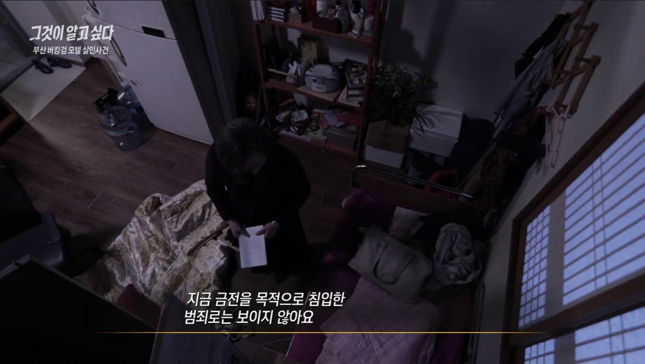 재현된 현장을 살펴본 전문가들은 금전을 목적으로 침입한 범죄로는 보이지 않는다고 했어요. 현장이 굉장히 어지러져 있었지만 서랍은 닫혀있었고 통장도 그대로 있었죠. 그리고 현금도 곳곳에 그대로 남아있었다고 했습니다.