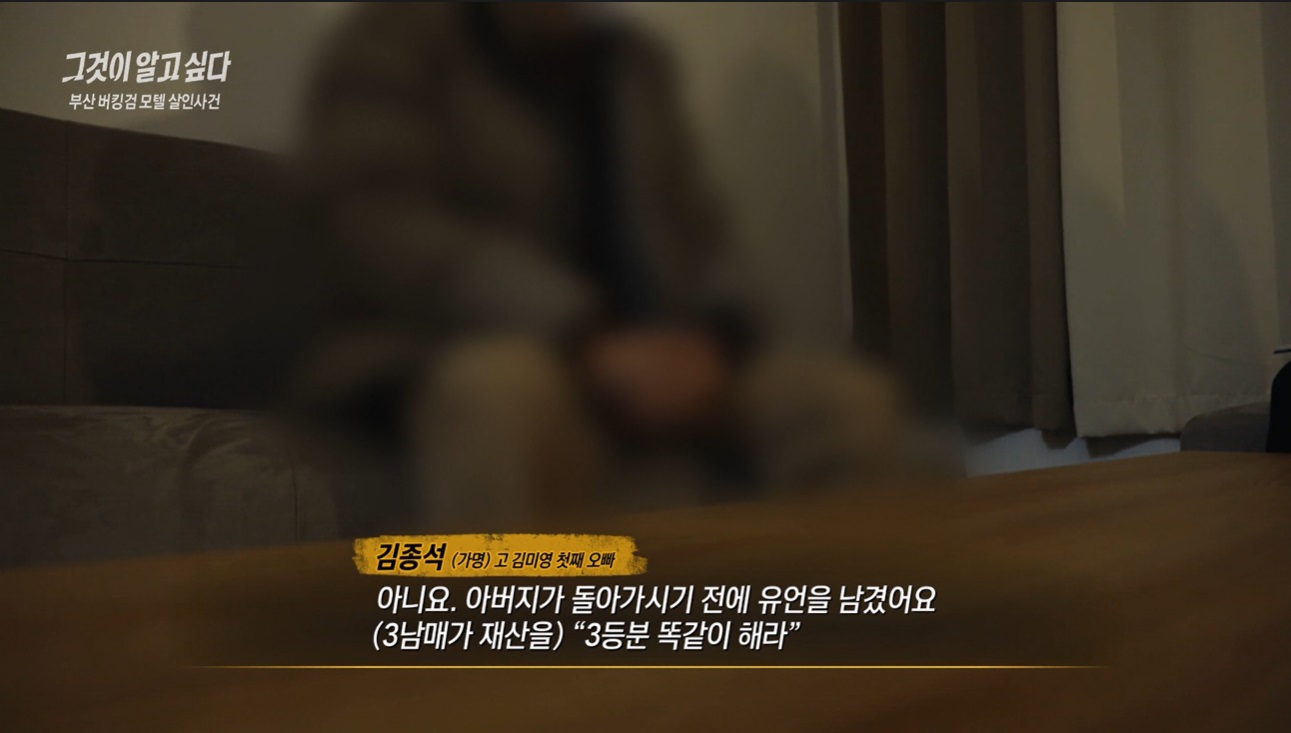 미영씨는 친한 지인이 많지 않았다고 했어요. 주변 상인들도 모텔 안에만 있어서 얼굴도 모른다고 하는 사람들이 대부분이었죠. 미영씨가 교류를 했던 것은 성당 사람들뿐인 것 같았어요. 그런데 미영씨가 성당 사람들에게 첫째 오빠가 아버지가 돌아가신 뒤 집을 뒤졌다는 얘기를 했었다고 했어요. 또 둘째 오빠가 사건 전날 미영씨를 만났기에 경찰에서는 둘째 오빠에 대한 의심을 거두지 않았었다고 합니다. 경찰은 유산 분배 문제로 인한 형제간의 살인이라는 것을 의심했다고 했어요. 하지만 오빠 둘 모두 사건이 발생한 부산이 아닌 다른 지역에 있었다는 알리바이가 있었다고 했죠.