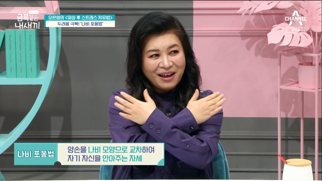 오은영 박사는 또 나비 포옹법을 알려주었어요. 나비 포옹법은 양손을 나비 모양으로 교차하여 자기 자신을 안아주는 자세죠. 스스로를 토닥여 마음을 안정시키게 하는 자세라고 했습니다.