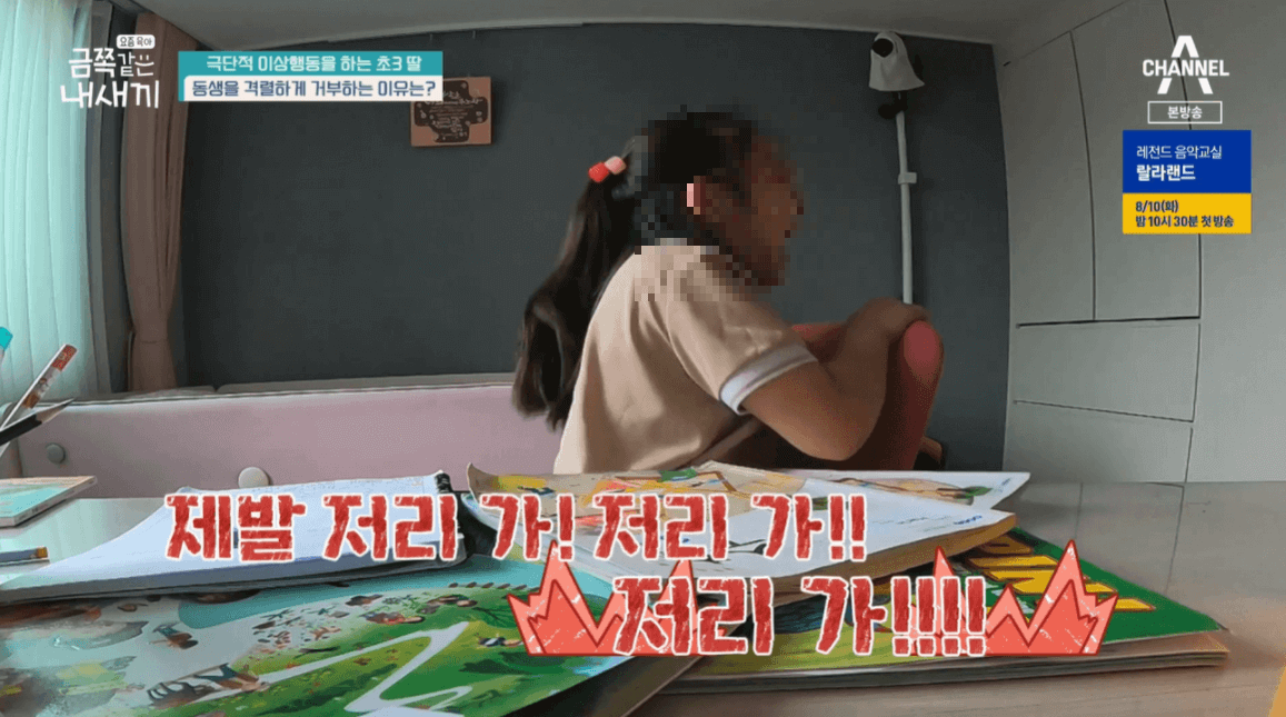 잠깐 보여진 금쪽이네 가족의 모습. 금쪽이는 막내 동생을 안고 있는 엄마에게 제발 저리 가라며 악을 써대고 있었어요. 고성을 지르며 동생을 거부하는 모습의 금쪽이 였습니다. 아기를 만진 손으로 본인을 만드는 것까지 거부할 정도로 동생에 대한 거부감이 엄청나 보였습니다. 다행히 동생을 해꼬지하거나 때리는 것은 아니라고 했어요.