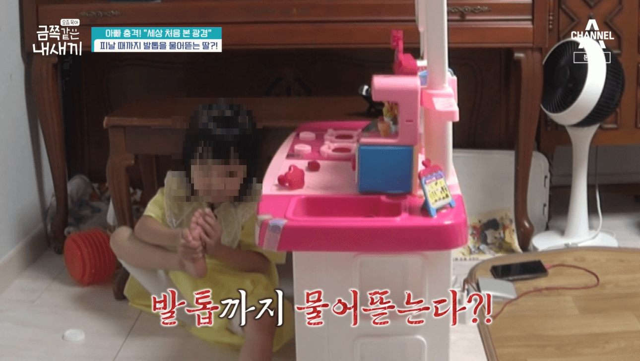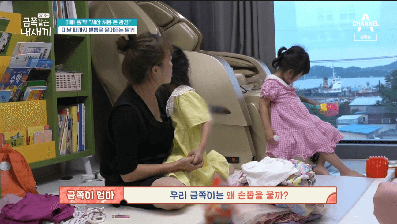 금쪽이는 동생과 잘 노는듯 싶더니 애착인형을 안고 손가락을 빨고 이내 발톱까지 물어뜯는 모습이었어요. 소리를 듣고 온 아빠는 금쪽이에게 왜 발톱을 뜯었냐며 큰소리를 쳤어요.