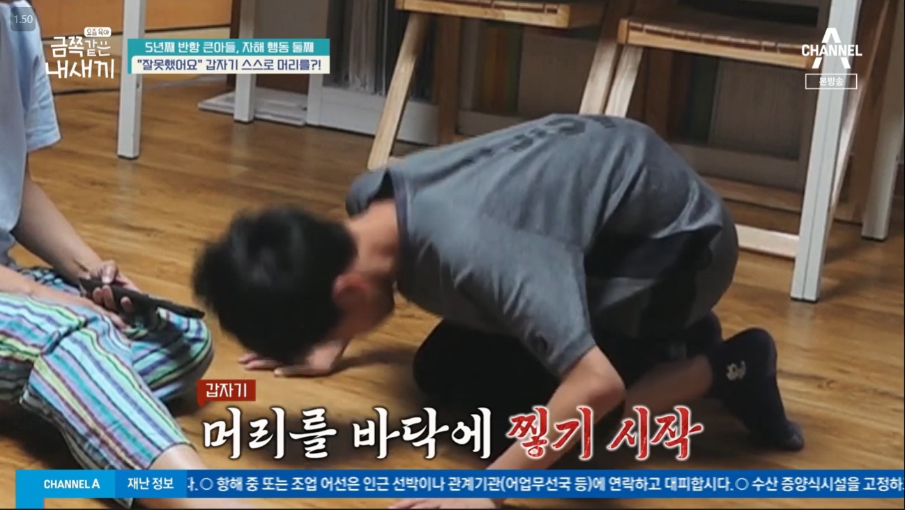 그리고 곧 충격적인 모습을 볼 수 있었어요. 금쪽이는 잘못했다고 하며 바닥에 머리를 찧기 시작하는 모습이었어요. 스스로 본인의 입도 세게 때리는 모습이었죠.