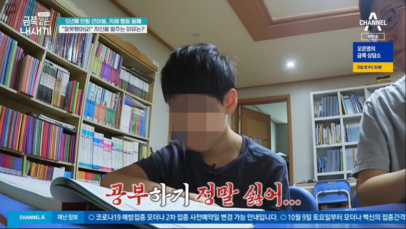 금쪽이는 공부를 너무나도 싫어하는 모습이었어요. 오만상을 쓰며 틱틱대는 태도를 보이자 엄마는 금쪽이를 꾸짖었고, 아빠 또한 그럴거면 하지 말라며 경고하는 모습이었죠. 그러자 이내 금쪽이는 또 다시 책상에 머리를 찧으며 잘못했다고 하면서 자해 행동을 보이는 모습이었습니다. 잘못했어요 죄송해요를 반복하는 금쪽이의 모습이었죠.