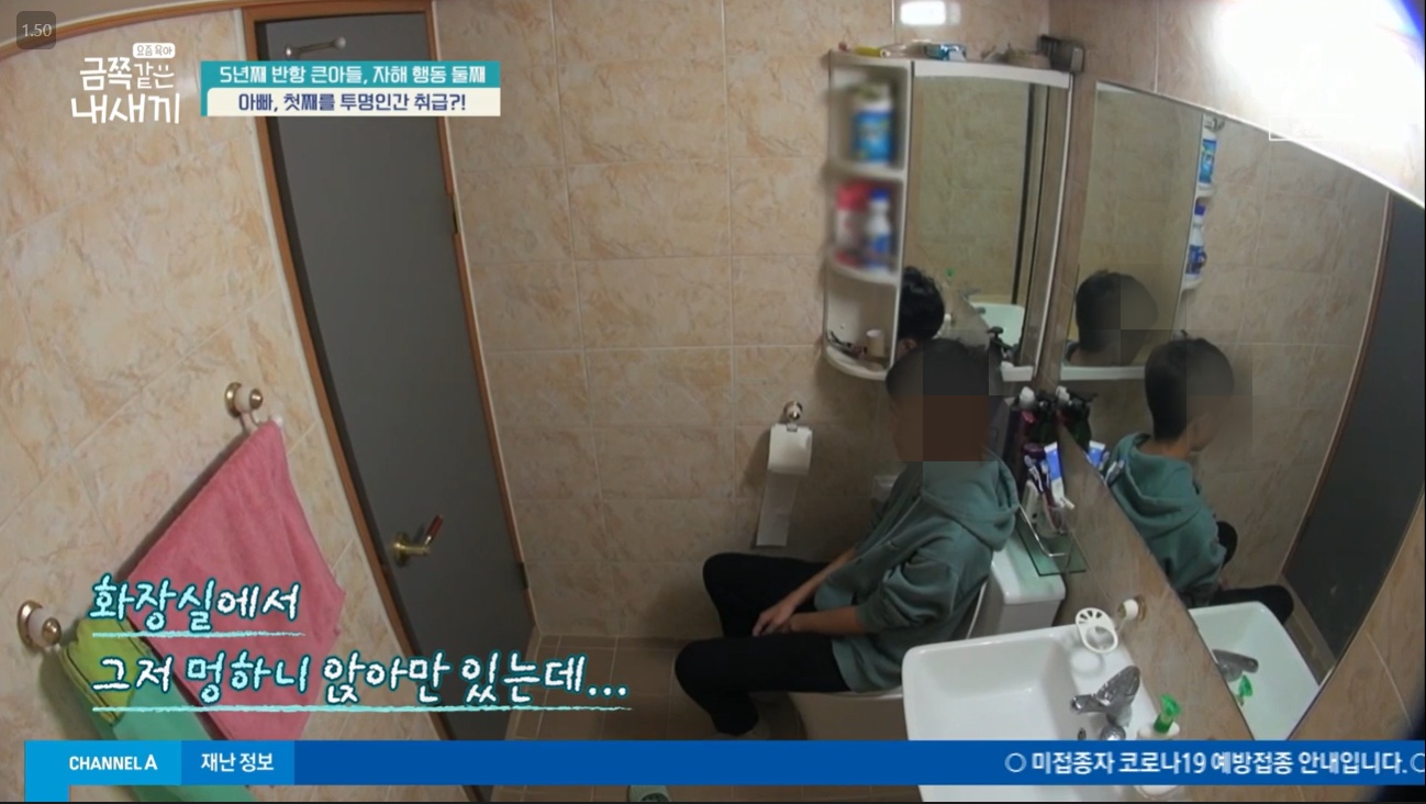 불편한 식사시간 뒤 잘먹었습니다 라고 역시 깍듯하게 인사를 하는 첫째 였지만 역시나 아빠는 묵묵부답이었습니다. 그리고 첫째 금쪽이는 화장실에 가 멍하니 앉아있었습니다. 금쪽이는 하루에 40~50분씩 저렇게 있는다고 했죠.