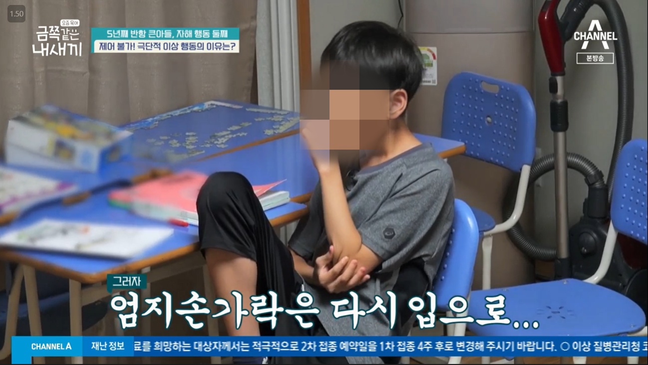 자해행동을 멈춘 금쪽이는 엄지손가락을 빠는 모습이었어요. 그러다 엄마가 쳐다보니 본인의 뺨을 때리기까지 했죠.