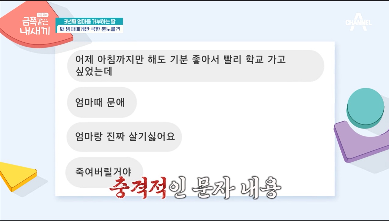 집으로 돌아와 빨래를 개려는 금쪽이 엄마. 금쪽이는 또 엄마가 본인의 옷을 만졌다며 한바탕 난리가 났어요. 화장실에 숨더니 할머니에게 문자를 보내는 모습이었습니다. 금쪽이는 문자로 할머니에게 엄마를 싫어하는 마음을 온통 표현하고 있었어요. 가장 충격적이었던 것은 엄마랑 진짜 살기 싫다며 엄마를 죽여버리겠다고 하는 말이었죠.