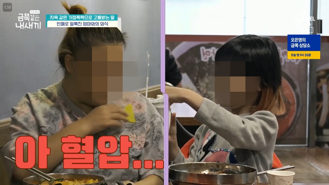 엄마와의 외식도 쉽지 않았어요. 금쪽이는 계속 장난을 치고 엄마 말을 듣지 않았어요. 엄마의 옷에 단무지를 올려놓는 금쪽이. 그런데 그런 행동을 하면서 주위의 눈치도 계속 보는 것 같았습니다.