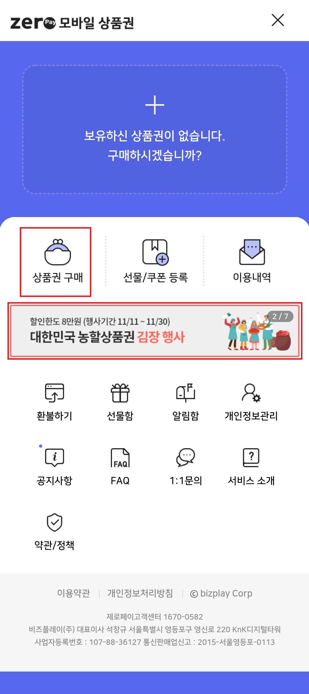 그러면 이렇게 제로모바일상품권 페이지로 들어가게 돼요. 현재 배너 부분에 대한민국 농할상품권 김장 행사 배너도 떠 있으니 클릭하신 후 내용 확인해보시면 됩니다. 상품권 구매 메뉴로 들어가시면 구매 가능한 상품권의 리스트가 떠요. 아직 오픈 전이어서 농할상품권은 떠 있지는 않았는데요, 11월 11일 10시 이후에 확인하시면 구매가 가능합니다.