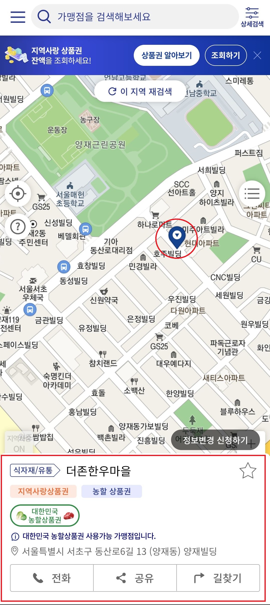 지맵이 사용하기 편한 것이 이렇게 하단에 상품권을 클릭하면 해당 상품권을 이용할 수 있는 주변 시장을 표시해주기 때문이에요. 하단 상품권 리스트중 대한민국 농할상품권을 선택하시면 지도 근처의 가맹점이 표시됩니다. 해당 가맹점 정보를 확인하시고 방문하시면 될 것 같습니다.