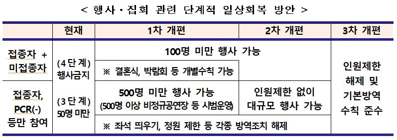 행사, 집회는 기본적으로 100명 미만으로 진행이 가능하며 백신접종완료자, PCR음성확인자 등만으로 구성시에는 500명 미만까지 진행이 가능합니다.