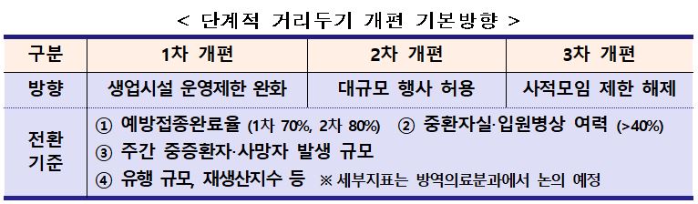 단계적 거리두기는 총 3단계로 이루어질 예정이에요. 1단계에는 생업시설 운영 제한을 완화하고, 2단계에는 대규모 행사를 허용, 3단계에는 사적모임 제한을 완전히 해제하는 방향으로 예정되어 있습니다.
