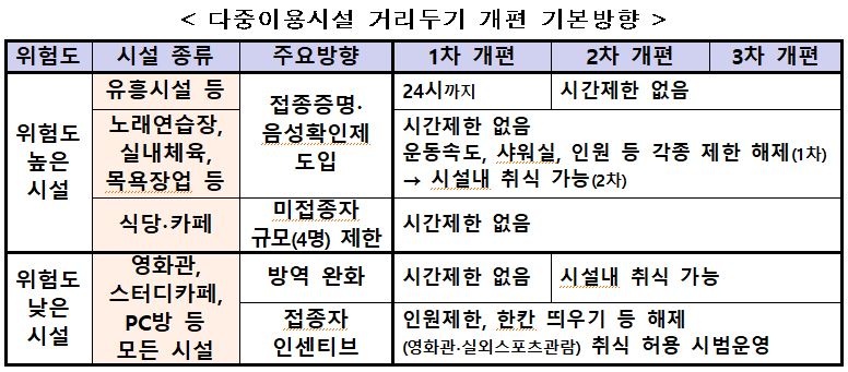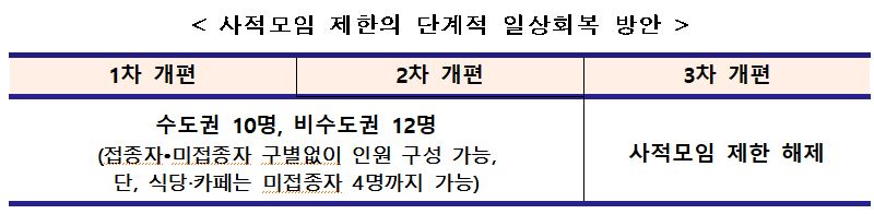 단계적 일상회복 2단계부터는 백신 접종 완료자만으로 구성시 인원 제한 해제, 취식까지 가능하게 될 것으로 보입니다.