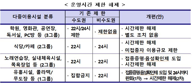 다중이용시설의 운영시간 제한은 해제되지만 시설의 종류에 따라 백신 미접종자 이용규모 제한 등의 제한은 적용됩니다.